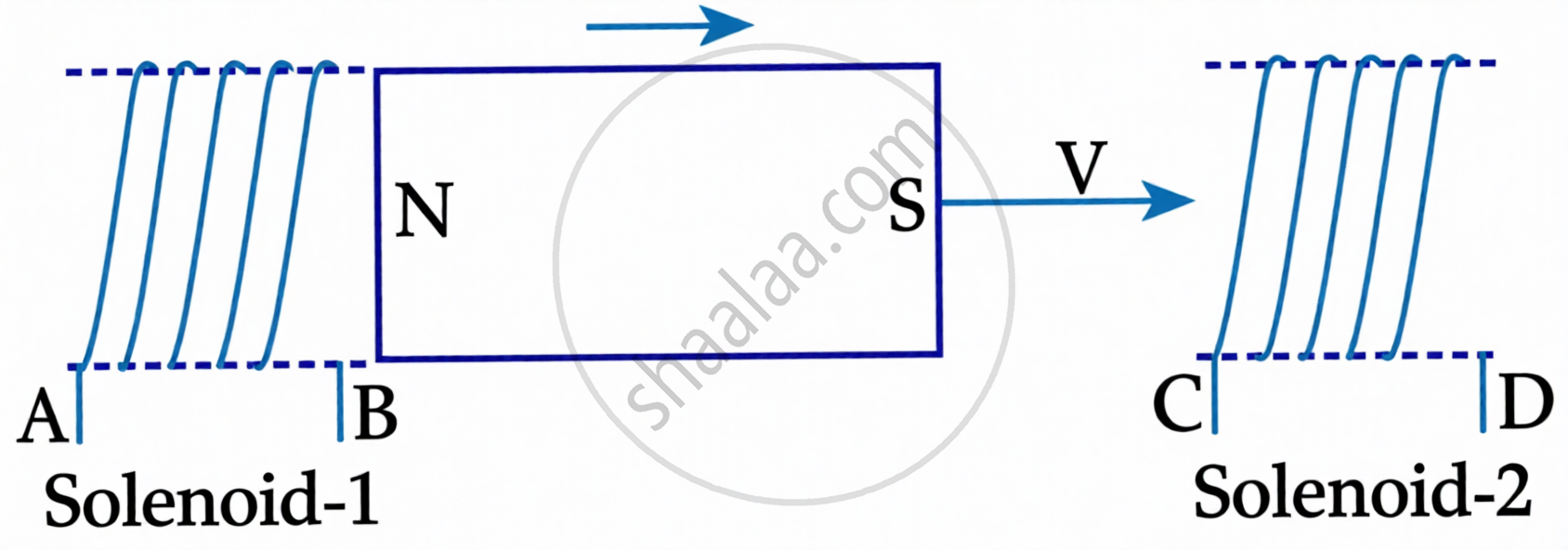 A bar magnet is moved in the direction indicated by the arrow between two coils PQ and CD. Predict the directions of induced current in each coil.