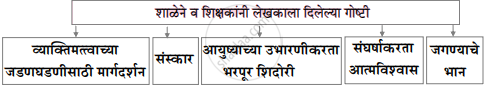 | लेखकाची माध्यमिक शाळा | लेखकाला घडवणारे शिक्षक | लेखकाचे जन्मगाव | ऋण व्यक्त न करता येणाऱ्या व्यक्ती | मुंबईतील घराचे नाव |