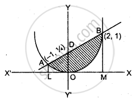 `= int_1^2 ("y"_2 - "y"_1)"dx"` जहाँ `x^2 = 4 "y"_1` व `x = 4 "y"_2 - 2`