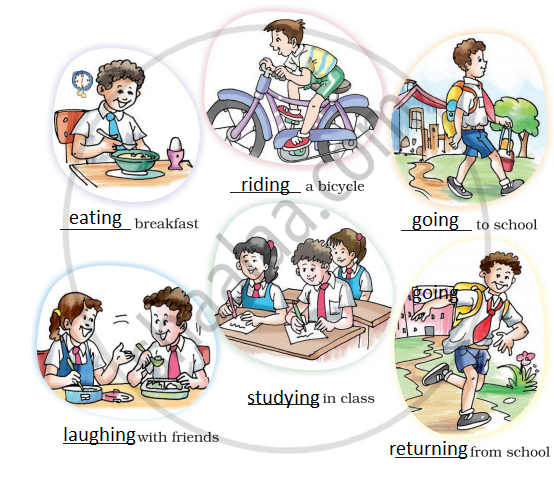 What are the children doing? Choose the correct word from the ribbon and then fill in the blanks.