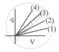 Figure shows plot of charge versus potential difference for four parallel plate capacitors, which have same plate area, dielectric medium but different distance between the plates. Which one of them have smallest plate distance?
