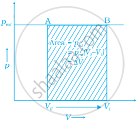 Piston is moved towards the inside to make the external pressure \[\ce{(P_{ext})}\] equal to p. Now, let us assume that this change takes place in a single step, hence, \[\ce{V}\] is the final volume. The work done by the piston is depicted in the graph shown below by shading the area.