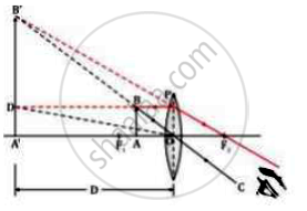 An object AB is placed between 2F1 and F1 on the principal axis of a convex lens as shown in the diagram. Copy the diagram and using three rays starting from point A, obtain the image of the object formed by the lens.