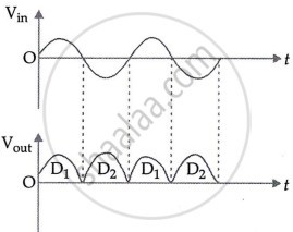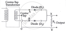 A full-wave rectifier has two diodes arranged in parallel at the terminals of the secondary winding of a centre-tapped step-down transformer. The load resistance RL is linked across the secondary winding and the diodes between points A and B, as seen in the circuit.