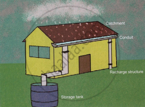 With the help of a diagram explain the component parts of a roof water harvesting system.