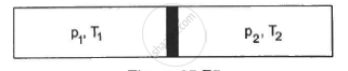 The container shown in figure has two chambers, separated by a partition, of volumes V1 = 2.0 litre and V2 = 3.0 litre. The chambers contain µ1 = 4.0 and µ2 = 5.0 moles of a gas at pressures p1 = 1.00 atm and p2 = 2.00 atm. Calculate the pressure after the partition is removed and the mixture attains equilibrium.