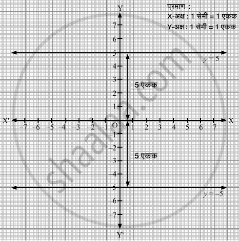 X-अक्षाला समांतर आणि X-अक्षापासून 5 एकक अंतरावर दोन रेषा आहेत. त्या रेषांची समीकरणे y = 5 व y = -5 आहेत.