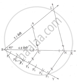 यदि ΔABC ~ ΔLBN, ΔABC में AB= 5.1 सेमी, ∠B = 40°, BC = 4.8 सेमी, `"AC"/"LN"` = `4/7` तो ΔABC तथा ΔLBN की रचना कीजिए।