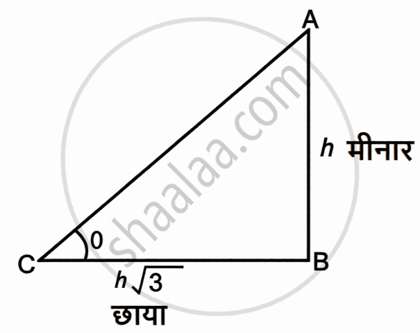 यदि किसी मीनार की छाया की लम्बाई उसकी ऊँचाई की `sqrt(3)` गुना है, तो सूर्य का उन्नतांश है: