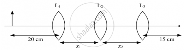 You are given three lenses L1, L2 and L3 each of focal length 15 cm. A object is kept at 20 cm in front of L1, as shown. The final real image is formed at the focus ‘I’ of L3. Find the separation between L1, L2 and L3.