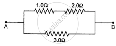 Two resistors of resistance 1.0 Ω and 2.0 Ω are connected in series and then this combination is connected in parallel with the resistor of resistance 3.0 Ω. The arrangement is shown in given figure alongside