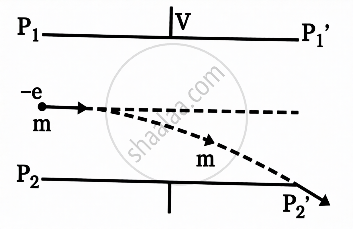 यदि प्रत्येक प्लेट की लम्बाई 3 cm हो तो उस विभवांतर V के मान का परिकलन कीजिए जिसको प्लेटों के बीच लगाने पर इलेक्ट्रॉन-पुंज ठीक सिरे `P_2^'` को छूता है।