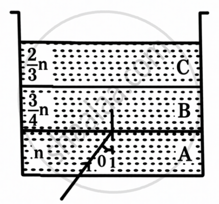 एक पारदर्शी पात्र में तीन अमिश्रणीय पारदर्शी द्रवों A, B एवं C की परतें विद्यमान हैं, जिनके अपवर्तनांक क्रमशः n, `3/4` n एवं `2/3` n हैं। A एवं B के अंतरापृष्ठ पर एक लेसर किरणपुंज θ कोण पर आपतित है जैसा चित्र में दर्शाया गया है। सिद्ध कीजिए कि θ के ऐसे सभी मानों के लिए जिन पर sin θ ≥ `2/3` हो यह किरणपुंज द्रव C में प्रविष्ट नहीं होगा।