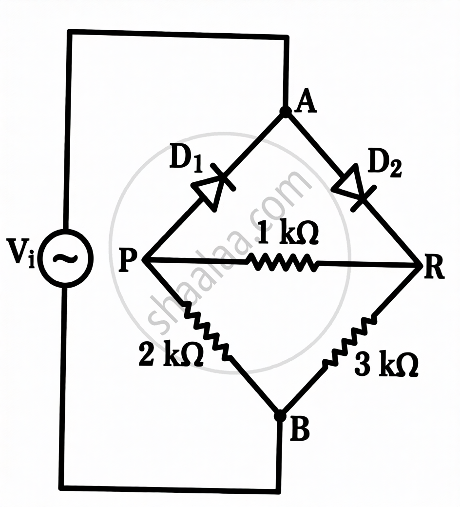 दो आदर्श डायोडों एवं तीन प्रतिरोधकों के नेटवर्क में सिरों A एवं B के बीच प्रत्यावर्ती (ac) वोल्टता Vi = 12 sin (100 πt) V चित्र में दर्शाए अनुसार लगाई गई है।
