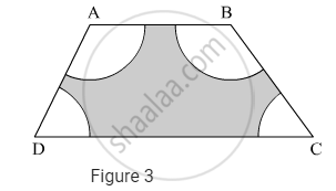 In Figure 3, ABCD is a trapezium with AB || DC, AB = 18 cm, DC = 32 cm and the distance between AB and DC is 14 cm. If arcs of equal radii 7 cm have been drawn, with centres A,B, C and D, then find the area of the shaded region.