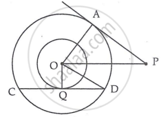 In two concentric circles, the radii are OA = r cm and OQ = 6 cm, as shown in the figure. Chord CD of larger circle is a tangent to smaller circle at Q. PA is tangent to larger circle. If PA = 16 cm and OP = 20 cm, the length CD.