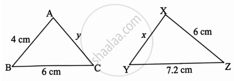 ऊपर दी गई आकृति में, यदि Δ АВС ~ Δ XYZ, तो x और y के मान ज्ञात कीजिए।