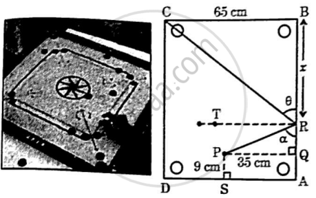 कैरम बोर्ड एक लोकप्रिय खेल है। बोर्ड वर्गाकार है जिसकी भुजा की लम्बाई 65 cm है। इसके प्रत्येक कोने में एक वृत्ताकार छंद है। अंज बिन्दु P पर रखी गोटी पर स्ट्राइकर से निशाना लगाता है। गोटी बोर्ड की B दीवार से टकराती हुई सीधे कोने C पर बने छेद मेंगिर जाती है। दिया गया है कि PS = 9 cm, PQ = 35 cm, BR = x, ∠PRQ = α तथा ∠CRB = θ है। |