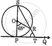 O केन्द्र वाले वृत्त पर खींची गयी स्पर्श-रेखा PQ है। यदि ∠POR = 65° है, तो ∠PTR का मान है: