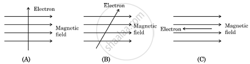 Study the following three diagrams in which the entry of an electron in a magnetic field is shown. Identify the case in which the magnetic force experienced by the electron is (i) maximum, and (ii) minimum. Give reason for your answers in each case.