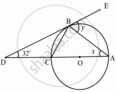 In the given diagram, O is the centre of the circle and the tangent DE touches the circle at B. If ∠ADB = 32°. Find the values of x and y.