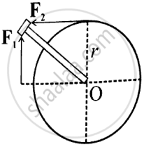 The diagram shows a wheel with a handle. Two forces, F1 and F2 of equal magnitudes are acting on the handle as shown in the diagram.