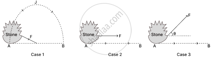 A stone is tied to a string and displaced from A to B by application of constant force F in three different ways as shown in the diagram below. Arrange the three cases in ascending order of the work done by the force.