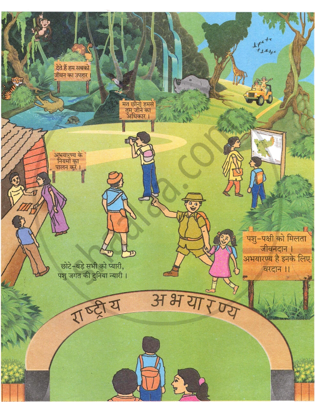 चित्र का निरीक्षण कीजिए। चित्र में दिखाई देने वाली वस्तुओं, प्राणियों के बारे में प्रश्न पूछें। विद्यार्थियों से प्रश्नोत्तर के माध्यम से अभयारण्य की आवश्यकता और वन्य प्राणियों के संरक्षण पर चर्चा कीजिए।