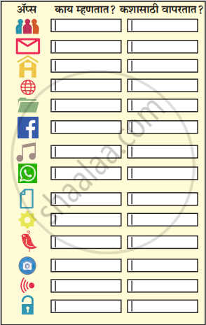 तुम्हांला येथे काही ॲप्सची सांकेतिक चिन्हे दिलेली आहेत. या चिन्हांना काय म्हणतात, ही ॲप्स कशासाठी वापरली जातात, याची माहिती घरातील मोठ्या व्यक्तींकडून जाणून घ्या व लिहा.