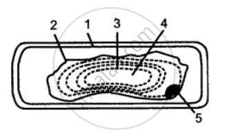 The below diagram represents a plant cell after being placed in a strong sugar solution. Guidelines 1 to 5 indicate the following: