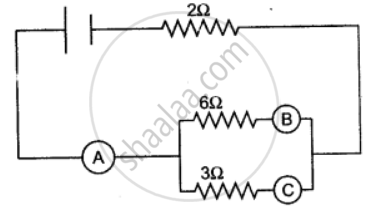 In the figure given below, A, B and C are three ammeters. The ammeter B reads 0.5A. (All the ammeters have negligible resistance.)