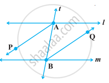 AP और BQ उन दो एकांतर अंतःकोणों के समद्विभाजक हैं जो समांतर रेखाओं l और m के तिर्यक रेखा t द्वारा प्रतिच्छेद से बनते हैं (आकृति)। दर्शाइए कि AP || BQ है।