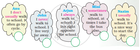 Read the speech bubbles. Who walks to school most often? Put them in order.