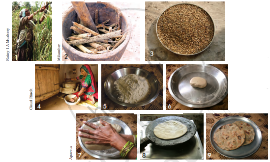 What technology could have been used to cut the stem in picture 1? What do you think is being done in the grinder (chakki ) in picture 4? What ways (technologies) would have been used to do the work shown in pictures 5 and 6? You can see that the dough is ready in picture 6. When do you think a sieve (chhalni ) would have been used? Discuss each step in detail, in any language you wish to use.
