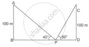 Two lamp-posts AB and CD each of height 100 m are on either side of the road. P is a point on the road between the two lamp-posts. The angles of elevation of the top of the lamp-posts from the point P are 60° and 40°. Find the distance PB and PD.