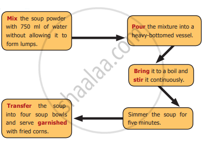 The packet is opened and the contents (i) __________ with 750 ml of water without allowing it to form lumps. The mixture (ii) __________ into a heavy-bottomed vessel. It (iii)_______ in low flame for five minutes. The soup (iv) _________ into soup bowls and (v) __________ with fried corns.